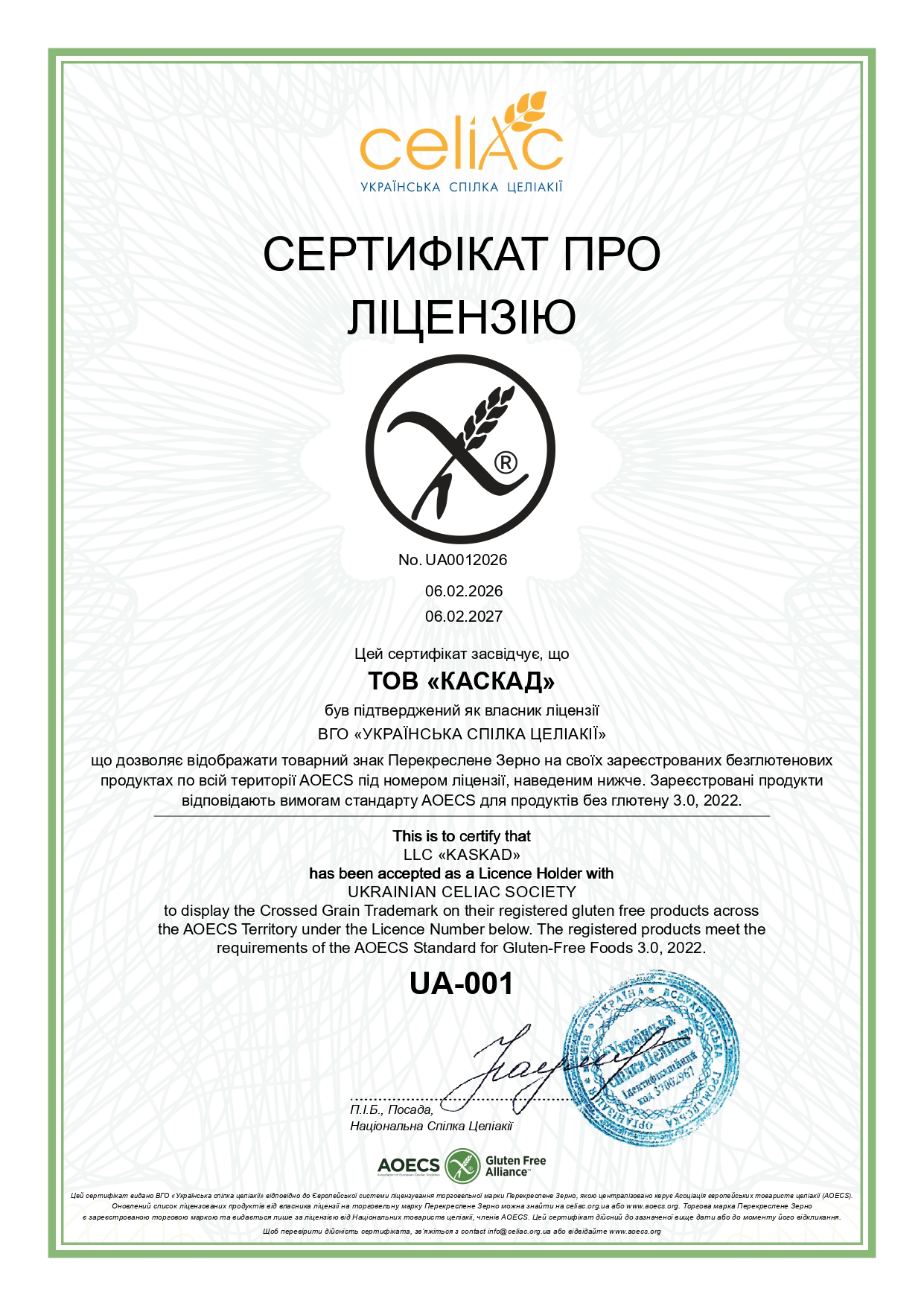 На виробництві впроваджений стандарт AOECS для безглютенових продуктів. Згідно з правилами AOECS, ліцензія видається на 1 рік, протягом якого ВГО “Українська спілка Целіакії“ буде проводити незалежний моніторинг.